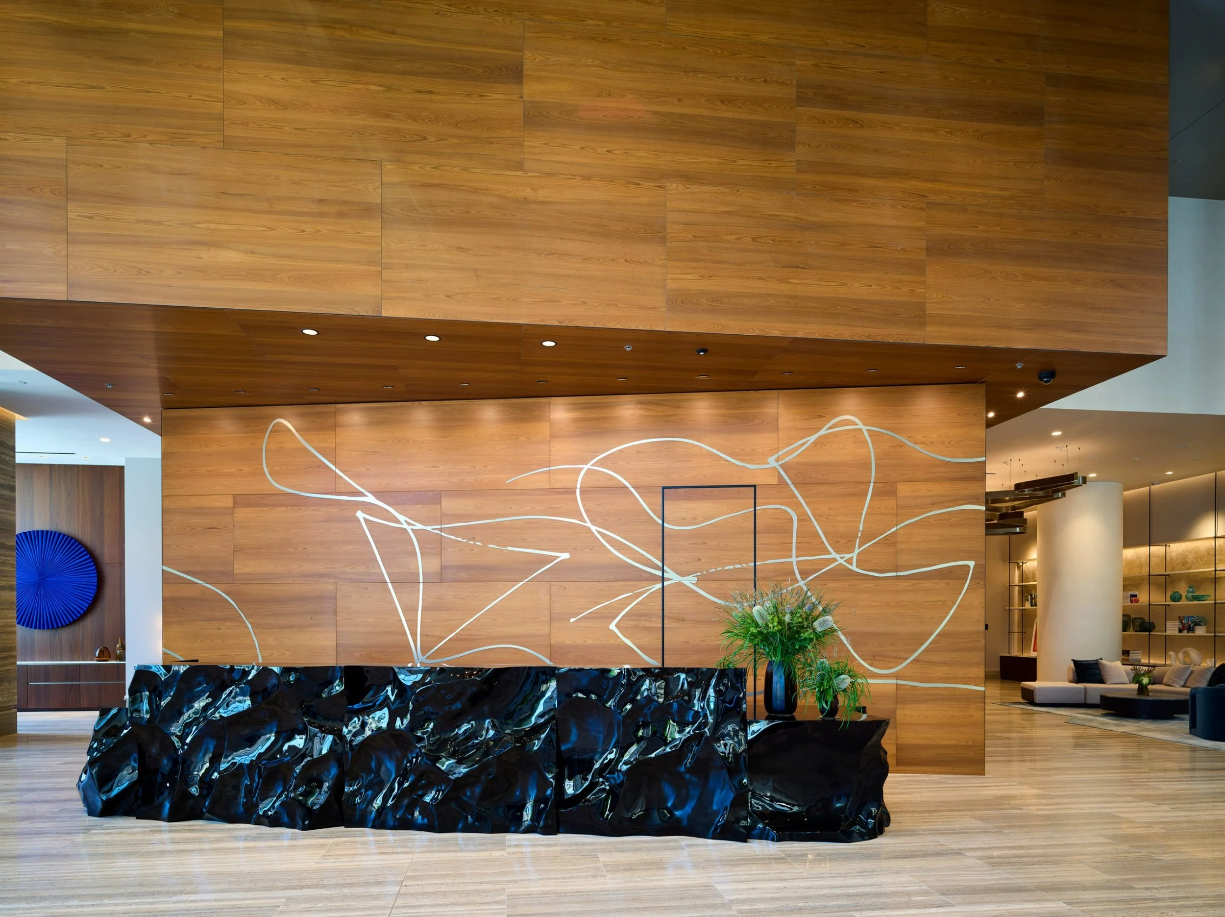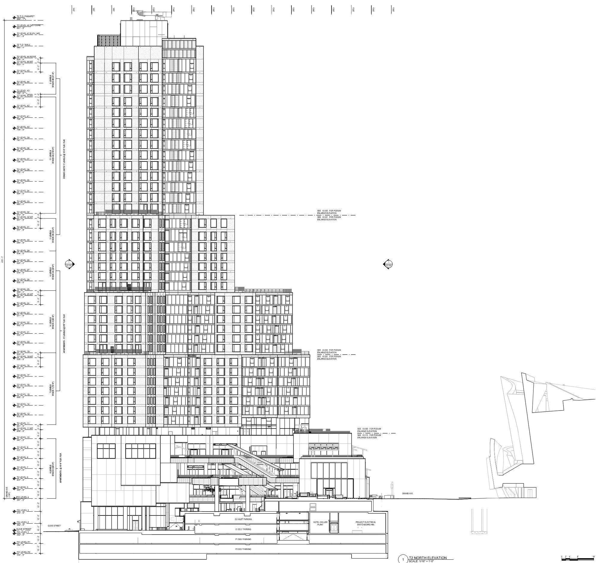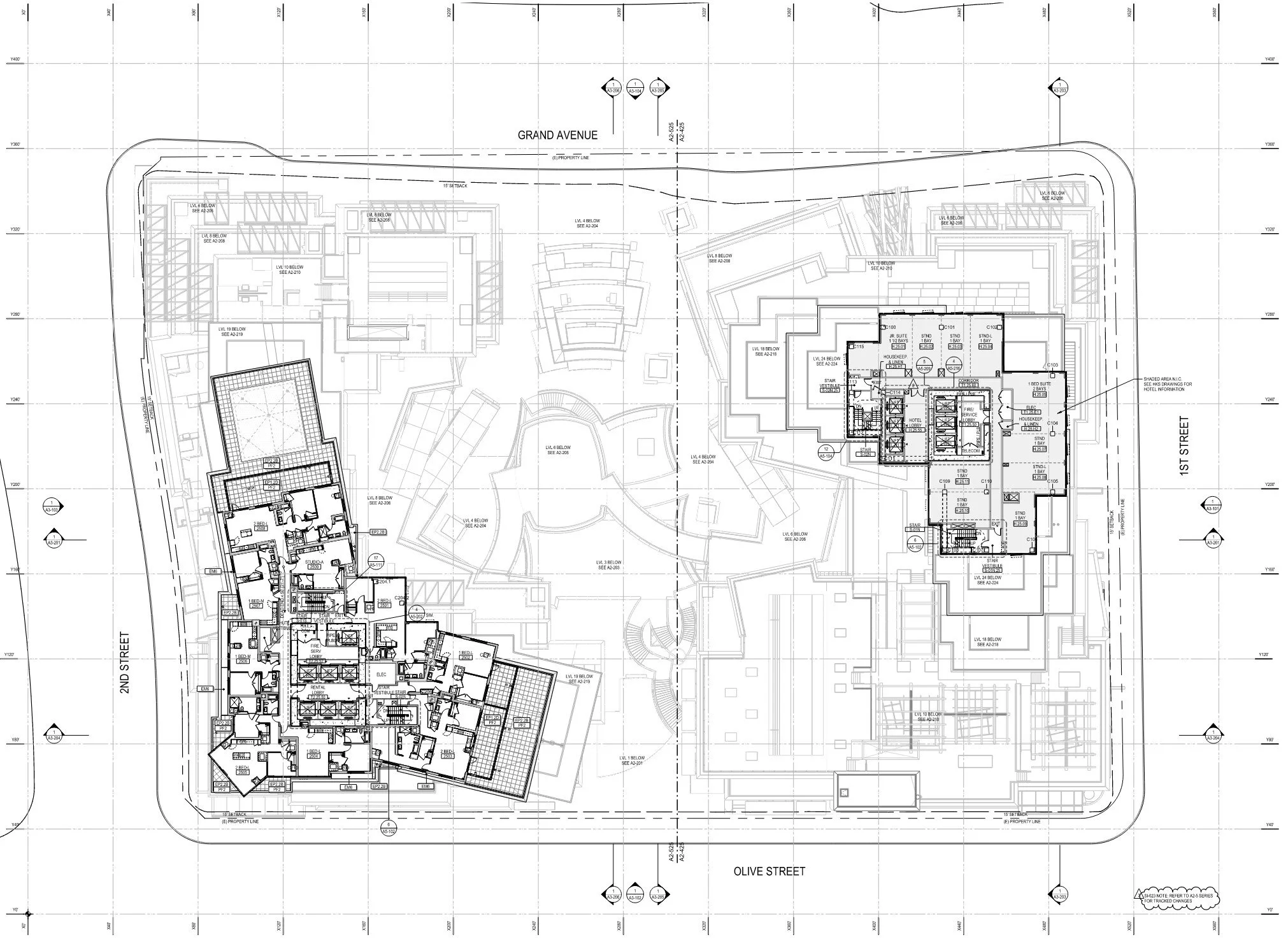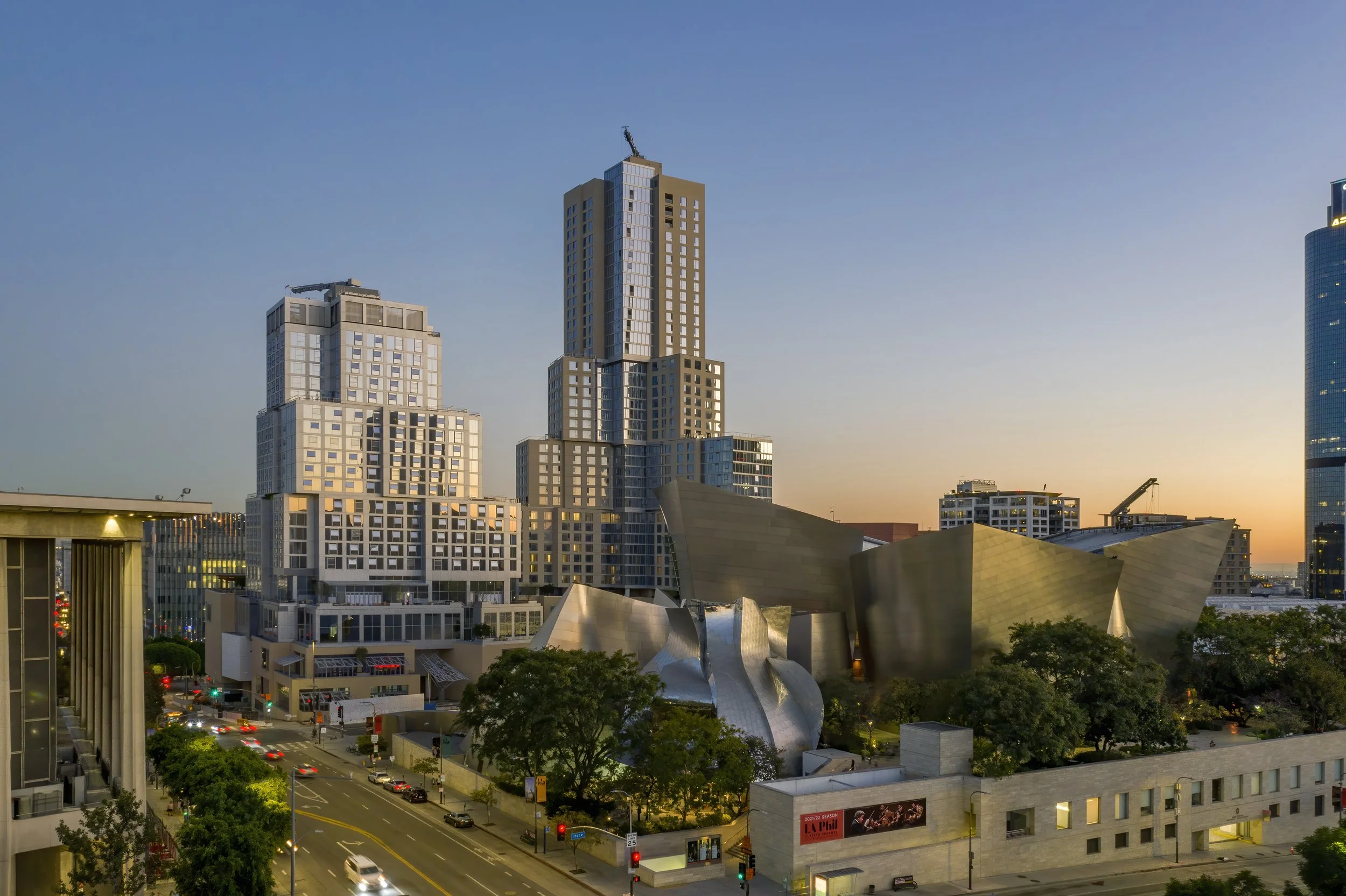 The Grand, positioned directly across from the Walt Disney Concert Hall, is a sophisticated development that includes luxury rental units, a hotel, restaurants, and retail spaces. Organized into two buildings, the 45-story rental tower and 28-story hotel tower create a three-story retail plaza that frames views of the Concert Hall. The design aims to urbanistically generate a dialogue between The Grand and Walt Disney Concert Hall through a contrasting architectural language and also focus on creating space between the two landmarks at the street level. The sloped site enables a terraced arrangement of retail spaces and a multi-level parking structure, smoothly connecting Grand Avenue to Olive Street. The massing of The Grand is designed to guide pedestrian movement through the development, integrating the experience with the nearby Walt Disney Concert Hall.